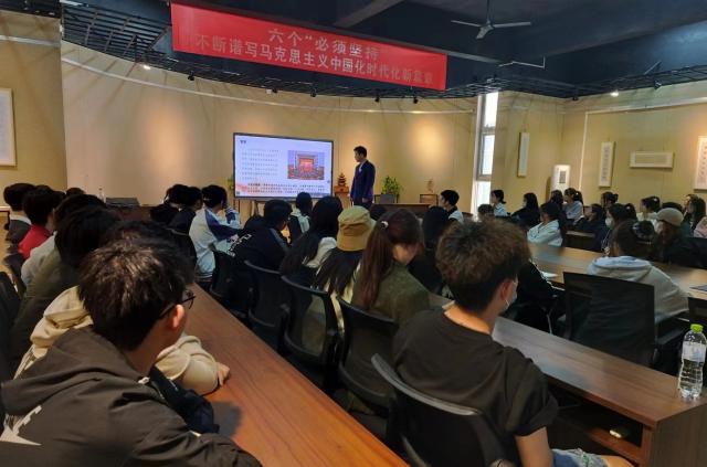 宣讲开始,聊城大学青年讲师团刘新宇用通俗易懂的语言从党的二十大的主题、内容等多个方面为同学们深入解读了党的二十大报告。紧接着讲解了六个“必须坚持”的内容,六个“必须坚持”即必须坚持人民至上,必须坚持自信自立,必须坚持守正创新,必须坚持问题导向,必须坚持系统观念,必须坚持胸怀天下。通过刘新宇的讲解,同学们全面、深入、准确地领会了六个“必须坚持”的深刻内涵和核心要义。刘新宇还绘声绘色地讲述了自己的支教经历,把自身经历与谱写马克思主义中国化时代化新篇章结合起来,将个人学习心得和成长收获与同学们进行分享,给同学们带来宝贵的实践经验。