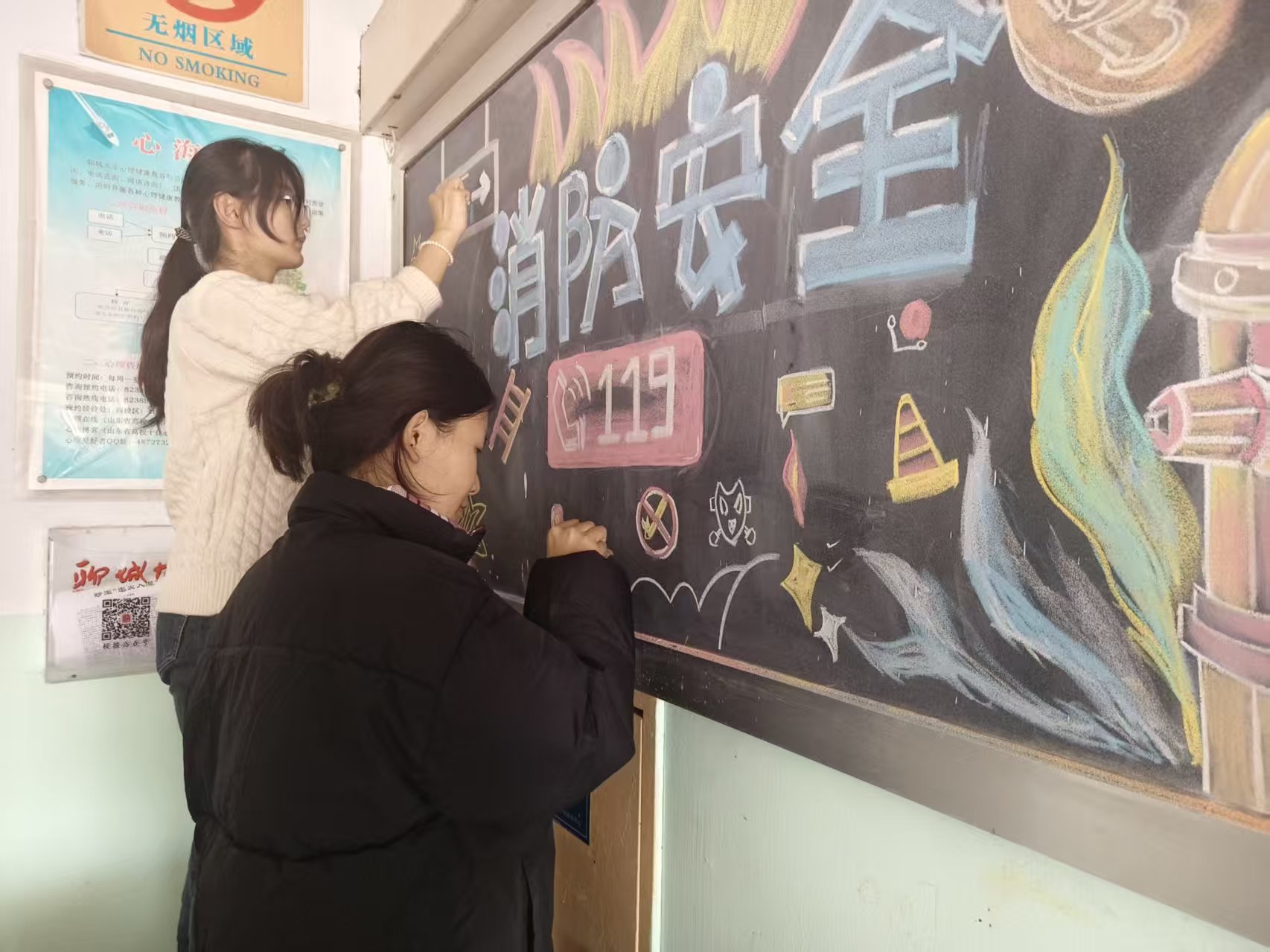 为了夯实校园消防安全根基,增强同学们对消防安全的重视,提升防火避险能力,美术与设计学院女生宿舍服务中心于11月4日在学苑公寓五号楼大厅开展了黑板报的创作,绘制了“一笔一画绘消防 校园安全有保障”主题黑板报。