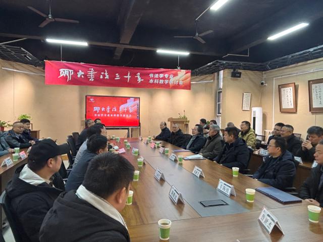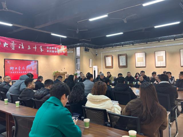 系列活动第二环节为“聊大书法三十年书法本科教学研讨会”,于美术与设计学院召开。于茂阳、郑培亮、刘宗超、刘元飞、向彬、王好军等专家学者依次发言,围绕书法学本科课程体系构建、传统技法教学创新、新时代书法人才培养路径等核心议题展开深入探讨。
