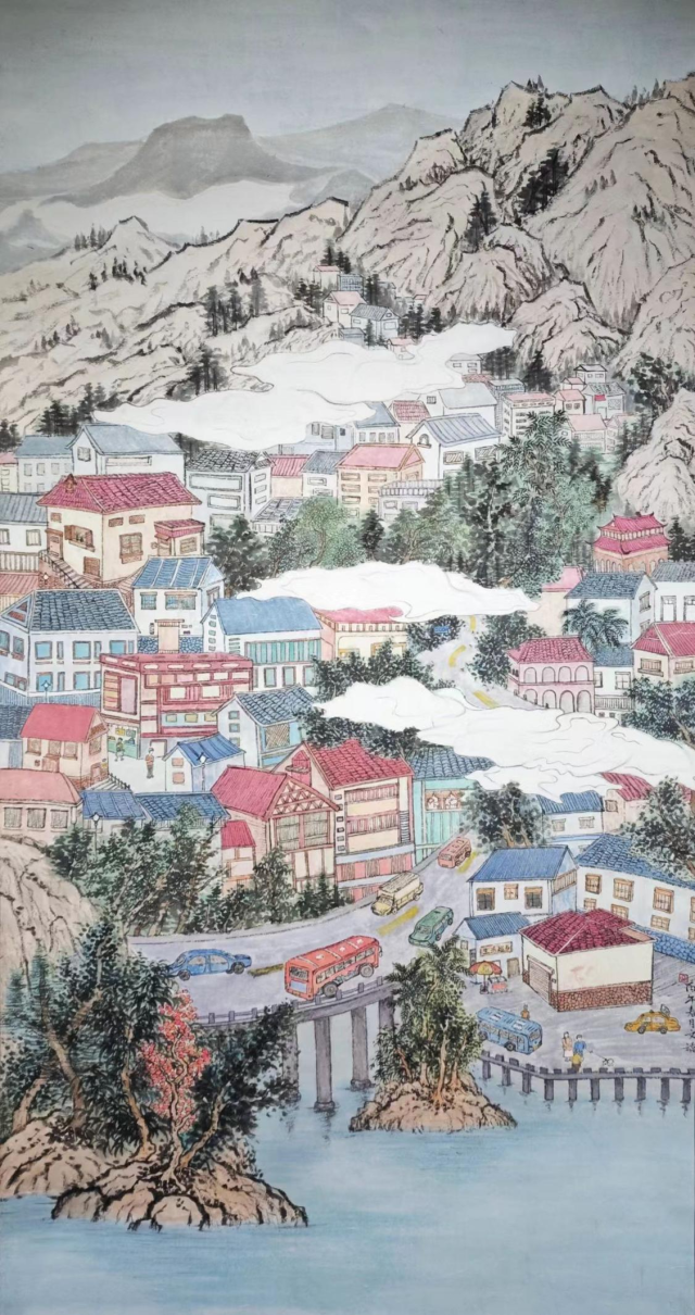 《岛城印象》是一幅现代城市山水画,以传统笔墨绘就当代海滨山城风貌。画面中山峦叠翠、云雾缭绕,错落的民居与穿梭的车流相映成趣,碧水石桥点缀其间,生动展现了岛城山海相依、城景交融的独特风貌与蓬勃生机。