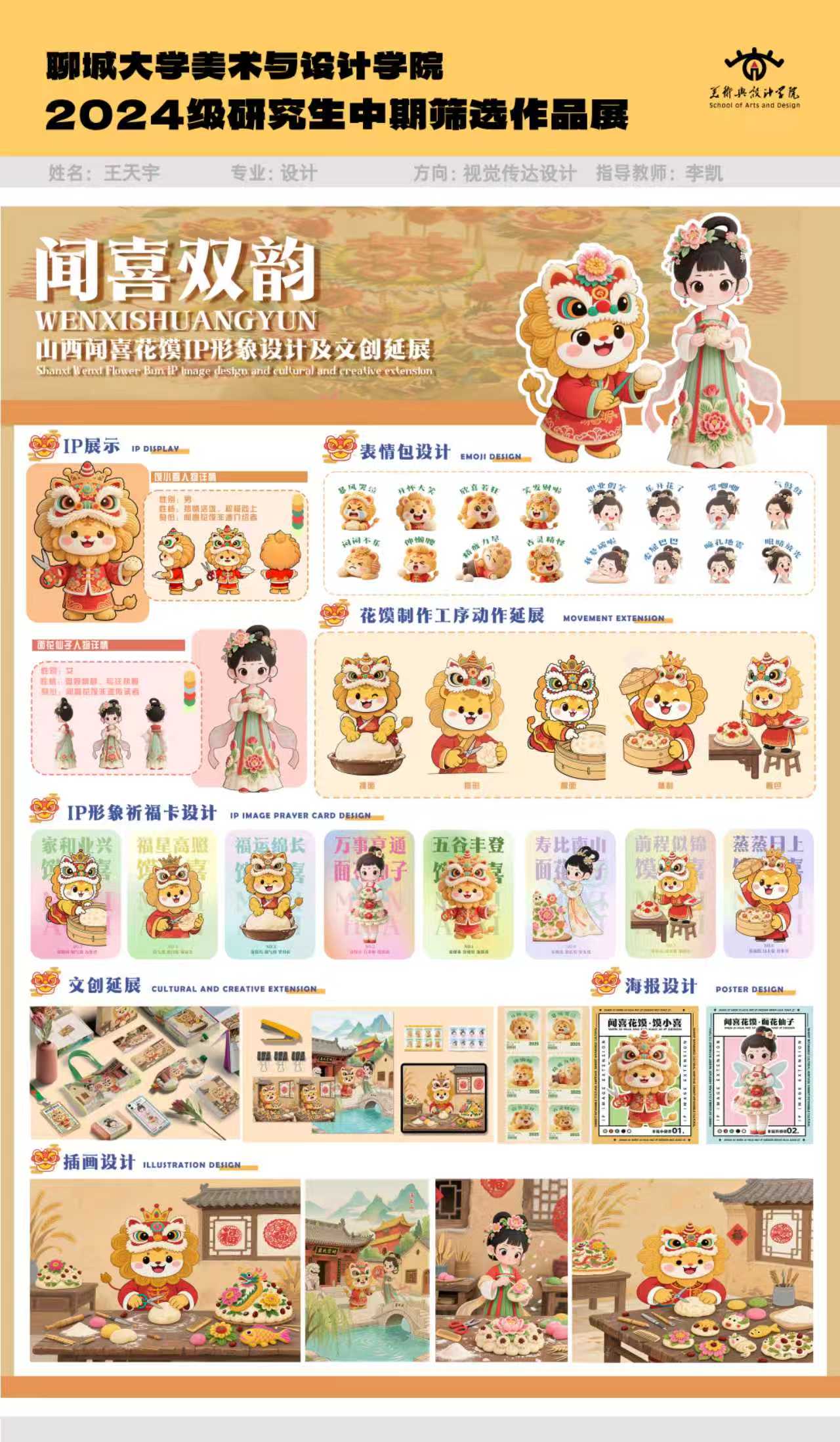 本作品以山西闻喜花馍非遗文化为创意核心,设计了“馍小喜”与 “面花仙子”两个IP形象,“馍小喜”以醒狮为形,传递热闹活力;“面花仙子”用古典仕女形象,展现花馍精巧与人文底蕴。整体设计借萌趣IP与实用文创,实现非遗文化的年轻化表达与生活化传承 ,让古老花馍在现代语境中绽放新韵。